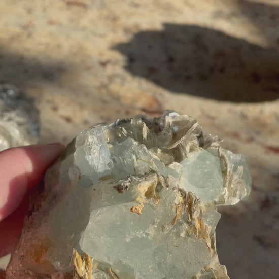 10.6oz of raw, hexagonal Aquamarine in Mica form is sourced from Afghanistan. This piece is especially appealing, as it is known to reduce anxiety and provide a sense of spiritual protection. Its presence and raw form are an ideal addition to any collection.